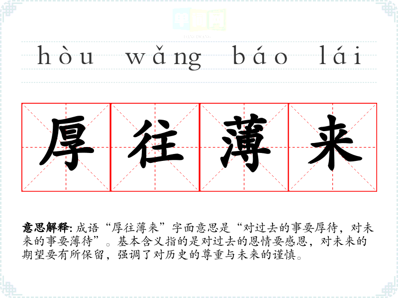成语“厚往来”字面意思是“对过去的事要厚待,对未来的事要待”。基本含义指的是对过去的恩情要感恩,对未来的期望要有所保留,强调了对历史的尊重与未来的谨慎。