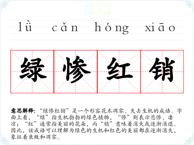 “绿惨红销”是一个形容花木凋零、失去生机的成语。字面上看,“绿”指生机勃勃的绿色植物,“惨”则表示悲惨、凄凉;“红”通常指美丽的花朵,而“销”意味着消失或逐渐消退。因此,该成语可以理解为绿色的生机和红色的美丽都在逐渐消失,象征着衰败和凋零。