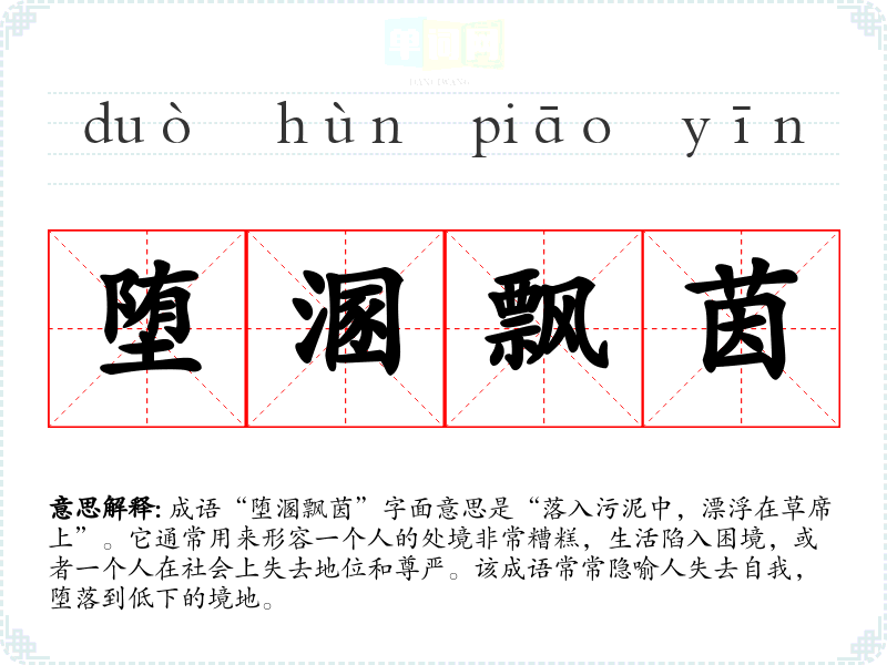 成语“堕溷飘茵”字面意思是“落入污泥中,漂浮在草席上”。它通常用来形容一个人的处境非常糟糕,生活陷入困境,或者一个人在社会上失去地位和尊严。该成语常常隐喻人失去自我,堕落到低下的境地。