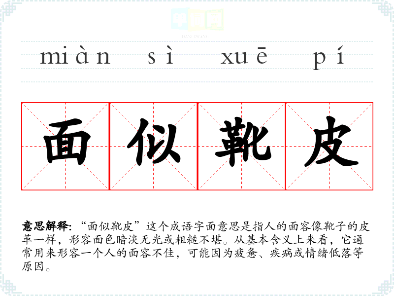 “面似靴皮”这个成语字面意思是指人的面容像靴子的皮革一样,形容面色暗淡无光或粗糙不堪。从基本含义上来看,它通常用来形容一个人的面容不佳,可能因为疲惫、疾病或情绪低落等原因。