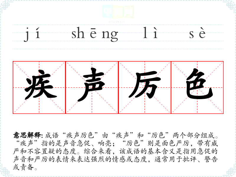 成语“疾声厉色”由“疾声”和“厉色”两个部分组成。“疾声”指的是声音急促、响亮;“厉色”则是面色严厉,带有威严和不容置疑的态度。综合来看,该成语的基本含义是指用急促的声音和严厉的表情来表达强烈的情感或态度,通常用于批评、警告或责备。