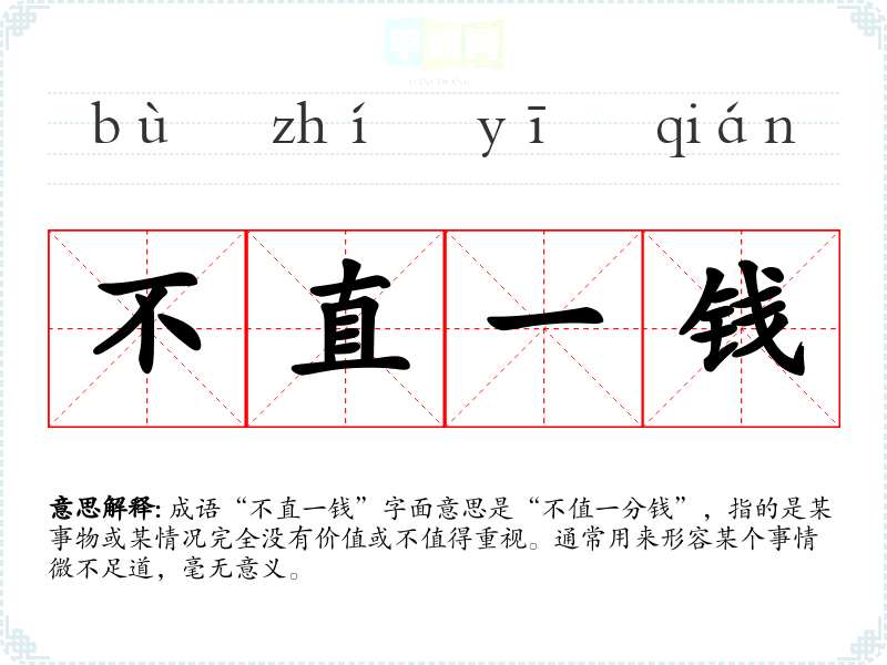 成语“不直一钱”字面意思是“不值一分钱”,指的是某事物或某情况完全没有价值或不值得重视。通常用来形容某个事情微不足道,毫无意义。