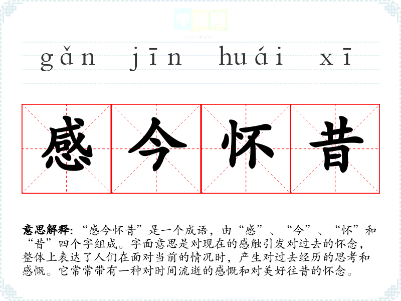 | 抚今怀昔 | 抚:拍,摸,引申为注意,注视;怀:怀念;昔:过去。看看现在,想想过去。形容对当前的事物有所感触而怀念过去的人事或景物。 |