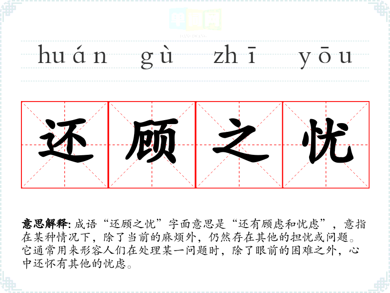成语“还顾之忧”字面意思是“还有顾虑和忧虑”,意指在某种情况下,除了当前的麻烦外,仍然存在其他的担忧或问题。它通常用来形容人们在处理某一问题时,除了眼前的困难之外,心中还怀有其他的忧虑。