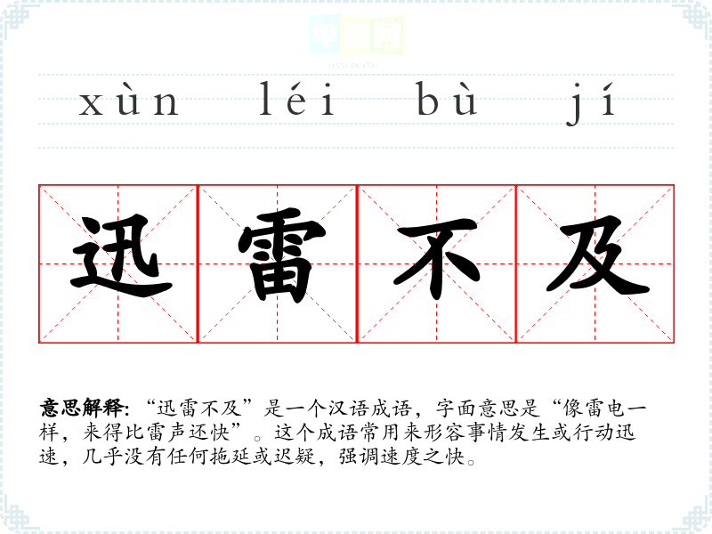 “迅雷不及”是一个汉语成语,字面意思是“像雷电一样,来得比雷声还快”。这个成语常用来形容事情发生或行动迅速,几乎没有任何拖延或迟疑,强调速度之快。