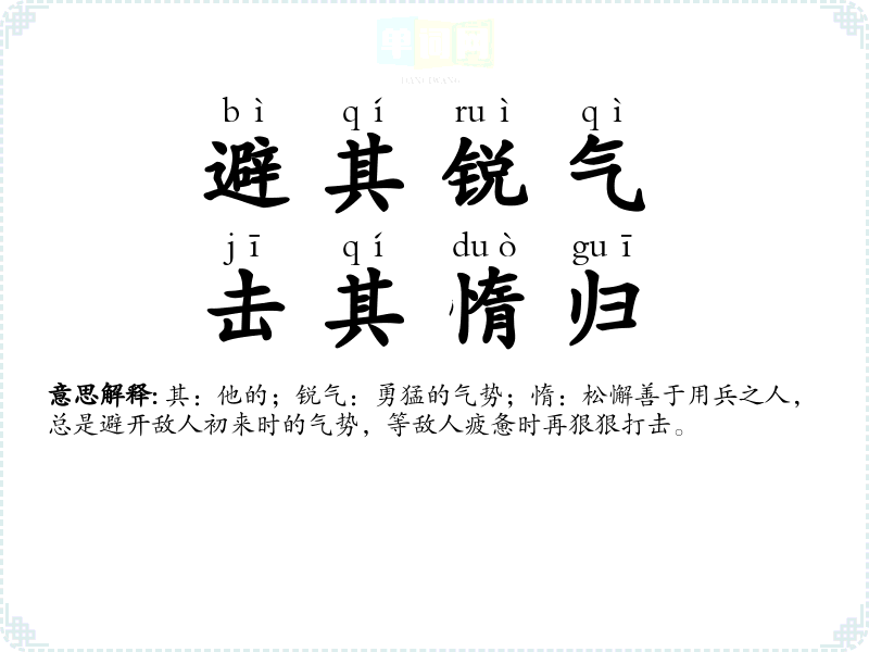 | 避其锐气,击其惰归 | 其:他的;锐气:勇猛的气势;惰:松懈善于用兵之人,总是避开敌人初来时的气势,等敌人疲惫时再狠狠打击。 |