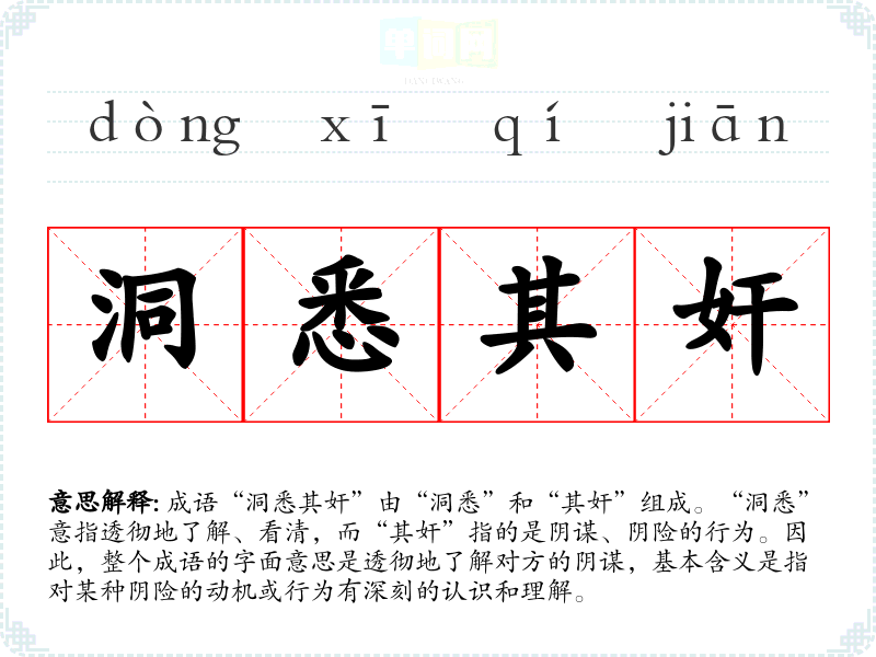 成语“洞悉其奸”由“洞悉”和“其奸”组成。“洞悉”意指透彻地了解、看清,而“其奸”指的是阴谋、阴险的行为。因此,整个成语的字面意思是透彻地了解对方的阴谋,基本含义是指对某种阴险的动机或行为有深刻的认识和理解。