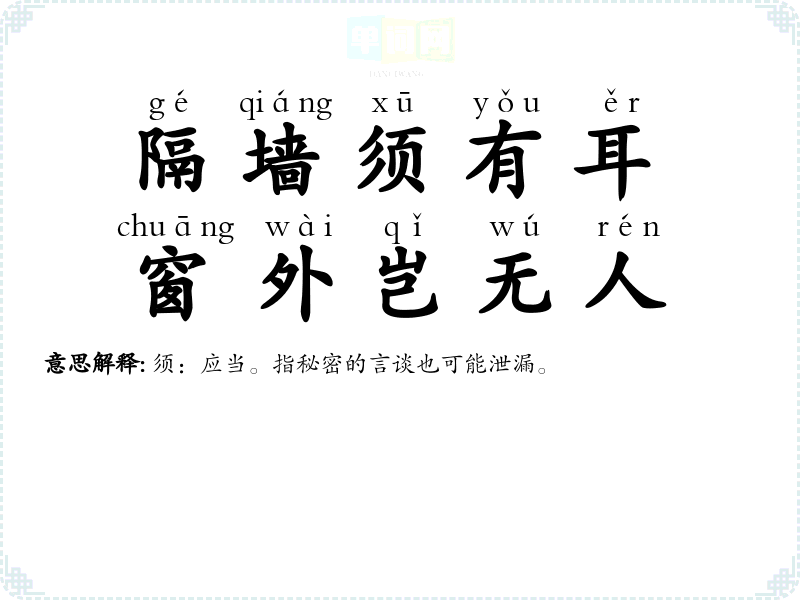 | 隔墙须有耳,窗外岂无人 | 须:应当。指秘密的言谈也可能泄漏。 |