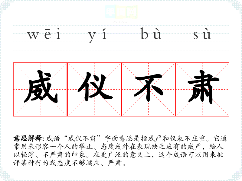 | 威仪不肃 | 威仪:严肃的容貌和庄重的举止;肃:恭敬,严肃。容貌和举止不庄重严肃。 |