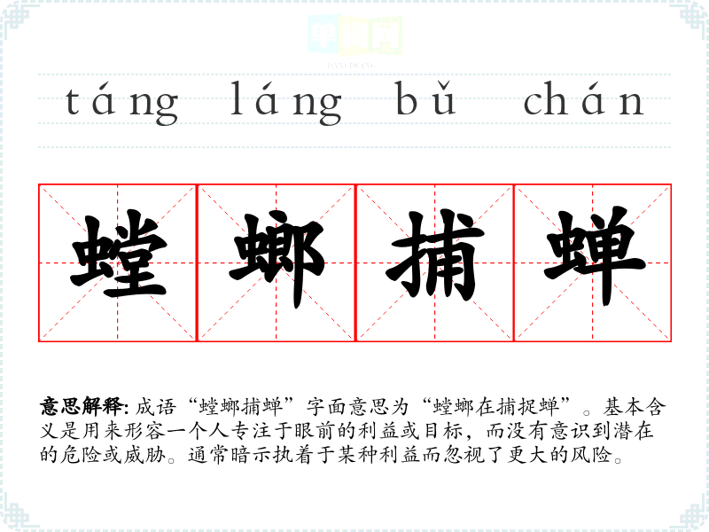 成语“螳螂捕蝉”字面意思为“螳螂在捕捉蝉”。基本含义是用来形容一个人专注于眼前的利益或目标,而没有意识到潜在的危险或威胁。通常暗示执着于某种利益而忽视了更大的风险。