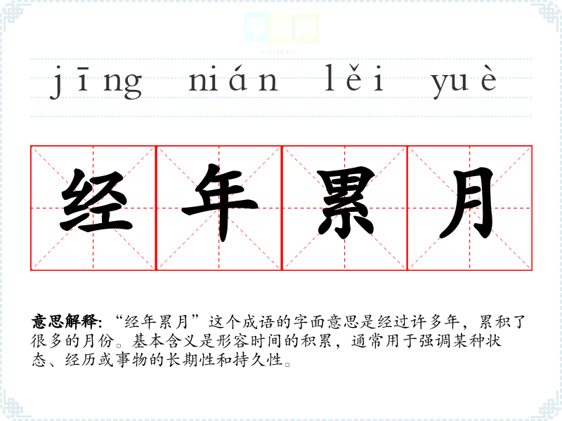 “经年累月”源于古汉语,常用于描述时间的漫长与持续。虽然具体的出处不详,但类似的表达在古代文献中屡见不鲜,反映了古人对时间流逝的深刻感悟。