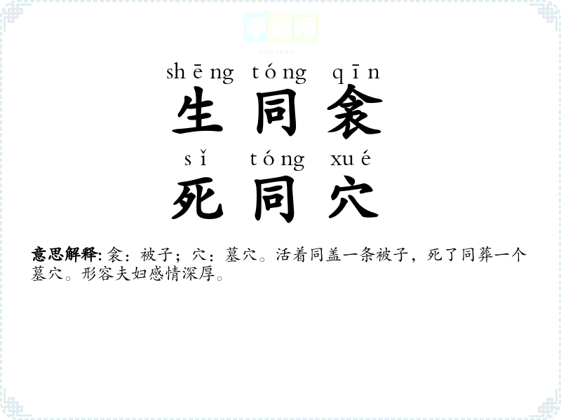 | 生同衾,死同穴 | 衾:被子;穴:墓穴。活着同盖一条被子,死了同葬一个墓穴。形容夫妇感情深厚。 |