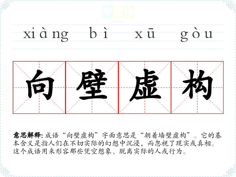 成语“向壁虚构”字面意思是“朝着墙壁虚构”。它的基本含义是指人们在不切实际的幻想中沉浸,而忽视了现实或真相。这个成语用来形容那些凭空想象、脱离实际的人或行为。