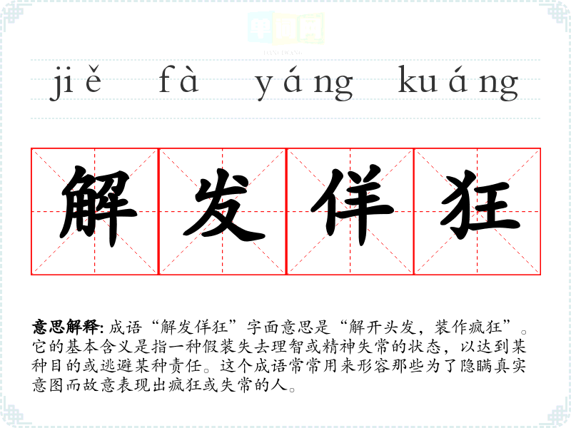成语“解发佯狂”字面意思是“解开头发,装作疯狂”。它的基本含义是指一种假装失去理智或精神失常的状态,以达到某种目的或逃避某种责任。这个成语常常用来形容那些为了隐瞒真实意图而故意表现出疯狂或失常的人。