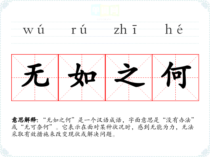 “无如之何”是一个汉语成语,字面意思是“没有办法”或“无可奈何”。它表示在面对某种状况时,感到无能为力,无法采取有效措施来改变现状或解决问题。