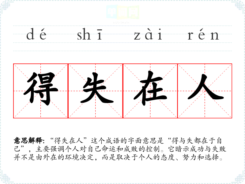 “得失在人”这个成语的字面意思是“得与失都在于自己”,主要强调个人对自己命运和成败的控制。它暗示成功与失败并不是由外在的环境决定,而是取决于个人的态度、努力和选择。