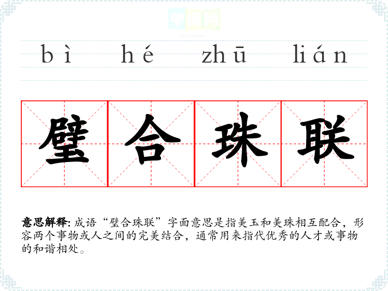 成语“璧合珠联”字面意思是指美玉和美珠相互配合,形容两个事物或人之间的完美结合,通常用来指代优秀的人才或事物的和谐相处。