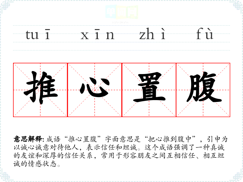 成语“推心置腹”字面意思是“把心推到腹中”,引申为以诚心诚意对待他人,表示信任和坦诚。这个成语强调了一种真诚的友谊和深厚的信任关系,常用于形容朋友之间互相信任、相互坦诚的情感状态。
