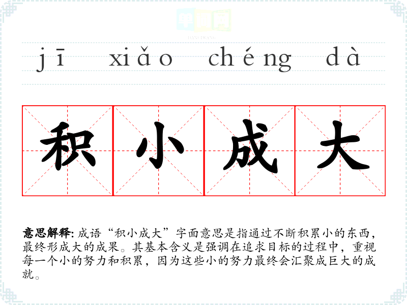 成语“积小成大”字面意思是指通过不断积累小的东西,最终形成大的成果。其基本含义是强调在追求目标的过程中,重视每一个小的努力和积累,因为这些小的努力最终会汇聚成巨大的成就。