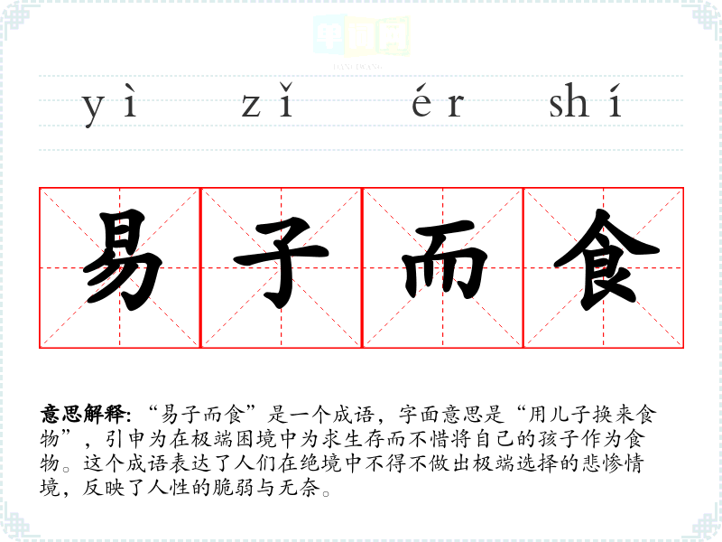 “易子而食”是一个成语,字面意思是“用儿子换来食物”,引申为在极端困境中为求生存而不惜将自己的孩子作为食物。这个成语表达了人们在绝境中不得不做出极端选择的悲惨情境,反映了人性的脆弱与无奈。