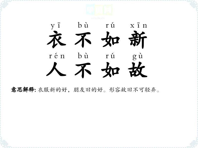 | 衣不如新,人不如故 | 衣服新的好,朋友旧的好。形容故旧不可轻弃。 |
