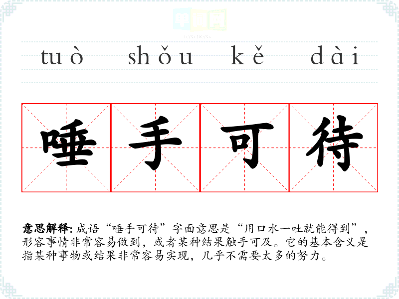 成语“唾手可待”字面意思是“用口水一吐就能得到”,形容事情非常容易做到,或者某种结果触手可及。它的基本含义是指某种事物或结果非常容易实现,几乎不需要太多的努力。