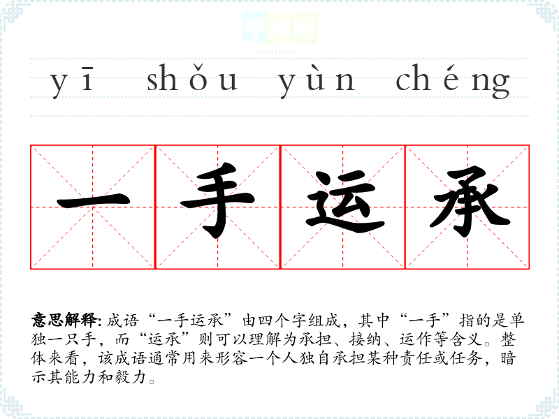 成语“一手运承”由四个字组成,其中“一手”指的是单独一只手,而“运承”则可以理解为承担、接纳、运作等含义。整体来看,该成语通常用来形容一个人独自承担某种责任或任务,暗示其能力和毅力。