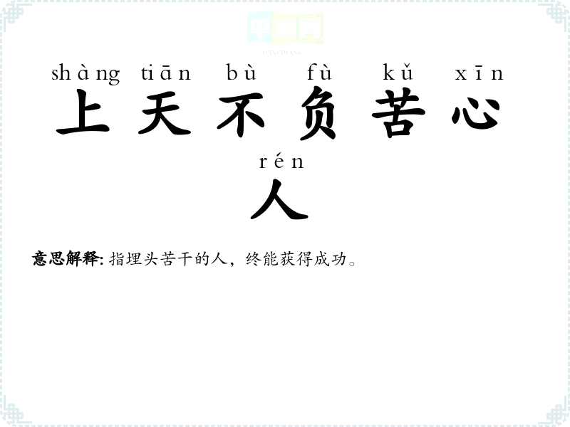 | 上天不负苦心人 | 指埋头苦干的人,终能获得成功。 |