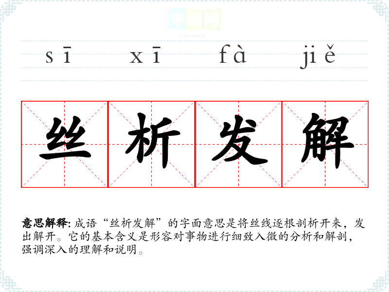 成语“丝析发解”的字面意思是将丝线逐根剖析开来,发出解开。它的基本含义是形容对事物进行细致入微的分析和解剖,强调深入的理解和说明。