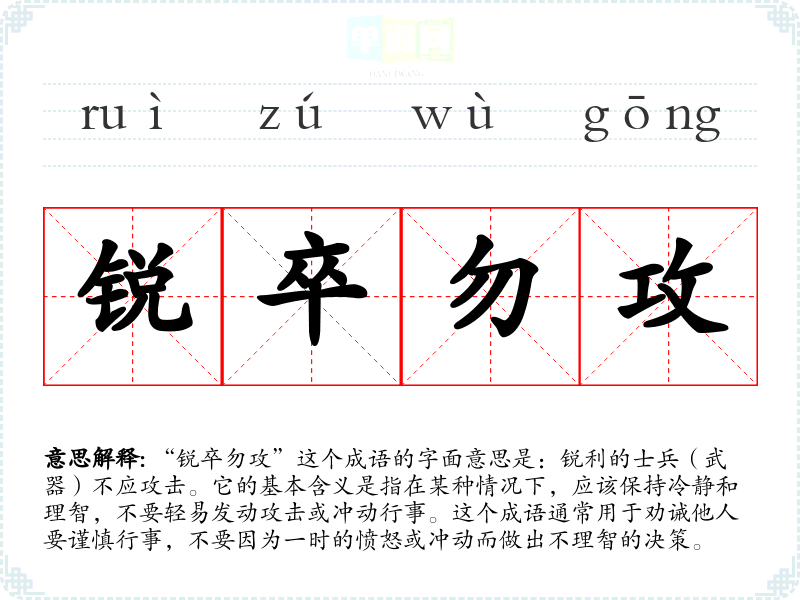“锐卒勿攻”这个成语的字面意思是:锐利的士兵(武器)不应攻击。它的基本含义是指在某种情况下,应该保持冷静和理智,不要轻易发动攻击或冲动行事。这个成语通常用于劝诫他人要谨慎行事,不要因为一时的愤怒或冲动而做出不理智的决策。