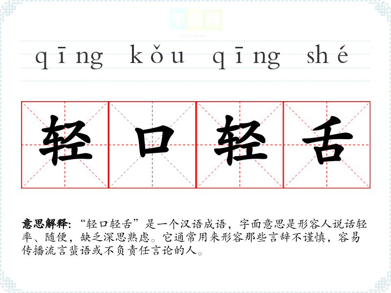 “轻口轻舌”是一个汉语成语,字面意思是形容人说话轻率、随便,缺乏深思熟虑。它通常用来形容那些言辞不谨慎,容易传播流言蜚语或不负责任言论的人。