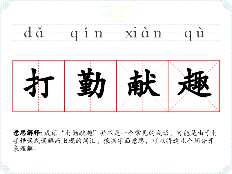 成语“打勤献趣”并不是一个常见的成语,可能是由于打字错误或误解而出现的词汇。根据字面意思,可以将这几个词分开来理解: