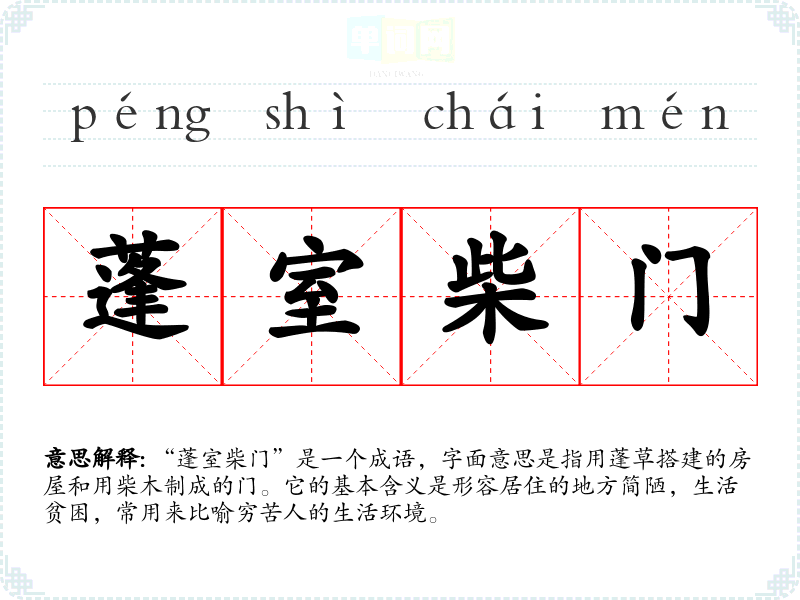 | 蓬户柴门 | 用柴草、树枝等做成的门户。形容居处简陋,生活困苦。 |