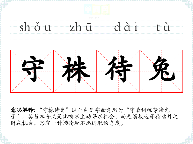 “守株待兔”这个成语字面意思为“守着树桩等待兔子”。其基本含义是比喻不主动寻求机会,而是消极地等待意外之财或机会,形容一种懒惰和不思进取的态度。