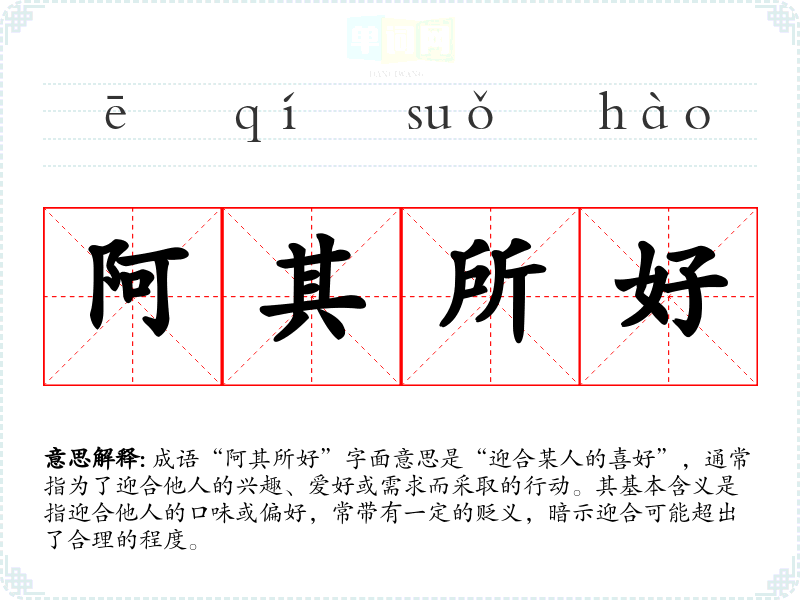 成语“阿其所好”字面意思是“迎合某人的喜好”,通常指为了迎合他人的兴趣、爱好或需求而采取的行动。其基本含义是指迎合他人的口味或偏好,常带有一定的贬义,暗示迎合可能超出了合理的程度。