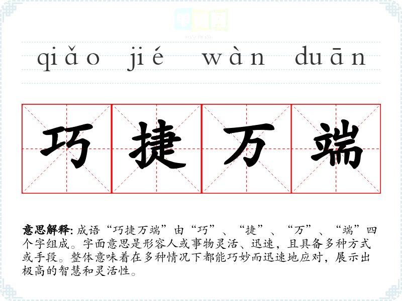 成语“巧捷万端”由“巧”、“捷”、“万”、“端”四个字组成。字面意思是形容人或事物灵活、迅速,且具备多种方式或手段。整体意味着在多种情况下都能巧妙而迅速地应对,展示出极高的智慧和灵活性。