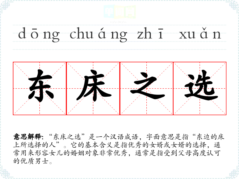 “东床之选”是一个汉语成语,字面意思是指“东边的床上所选择的人”。它的基本含义是指优秀的女婿或女婿的选择,通常用来形容女儿的婚姻对象非常优秀,通常是指受到父母高度认可的优质男士。