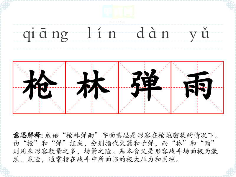 成语“枪林弹雨”字面意思是形容在枪炮密集的情况下。由“枪”和“弹”组成,分别指代火器和子弹,而“林”和“雨”则用来形容数量之多,场景之险。基本含义是形容战斗场面极为激烈、危险,通常指在战斗中所面临的极大压力和困境。