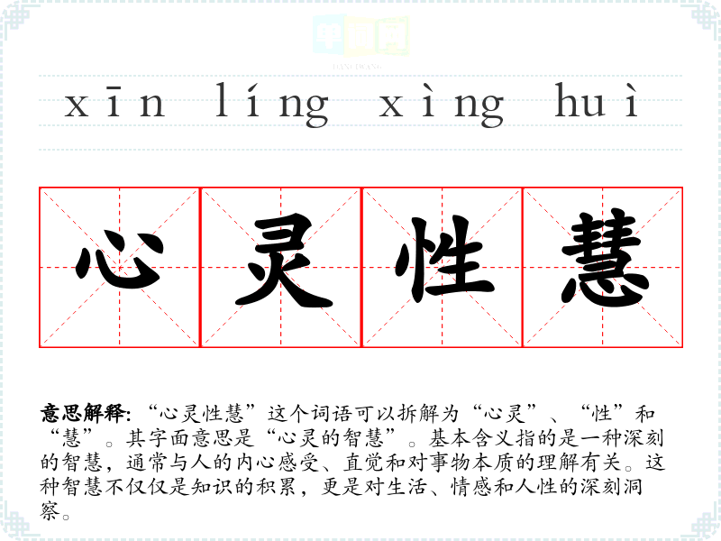 “心灵性慧”这个词语可以拆解为“心灵”、“性”和“慧”。其字面意思是“心灵的智慧”。基本含义指的是一种深刻的智慧,通常与人的内心感受、直觉和对事物本质的理解有关。这种智慧不仅仅是知识的积累,更是对生活、情感和人性的深刻洞察。
