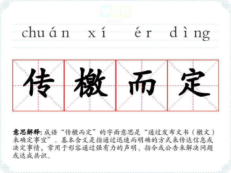 成语“传檄而定”的字面意思是“通过发布文书(檄文)来确定事宜”。基本含义是指通过迅速而明确的方式来传达信息或决定事情,常用于形容通过强有力的声明、指令或公告来解决问题或达成共识。