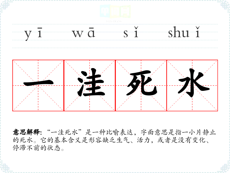 “一洼死水”是一种比喻表达,字面意思是指一小片静止的死水。它的基本含义是形容缺乏生气、活力,或者是没有变化、停滞不前的状态。
