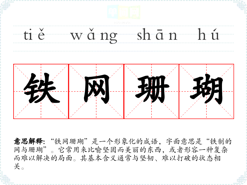 “铁网珊瑚”是一个形象化的成语,字面意思是“铁制的网与珊瑚”。它常用来比喻坚固而美丽的东西,或者形容一种复杂而难以解决的局面。其基本含义通常与坚韧、难以打破的状态相关。