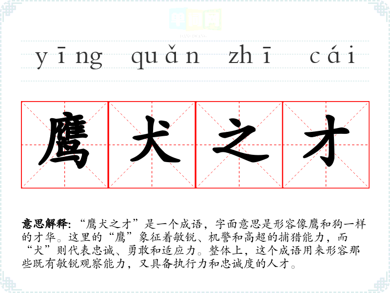 “鹰犬之才”是一个成语,字面意思是形容像鹰和狗一样的才华。这里的“鹰”象征着敏锐、机警和高超的捕猎能力,而“犬”则代表忠诚、勇敢和适应力。整体上,这个成语用来形容那些既有敏锐观察能力,又具备执行力和忠诚度的人才。