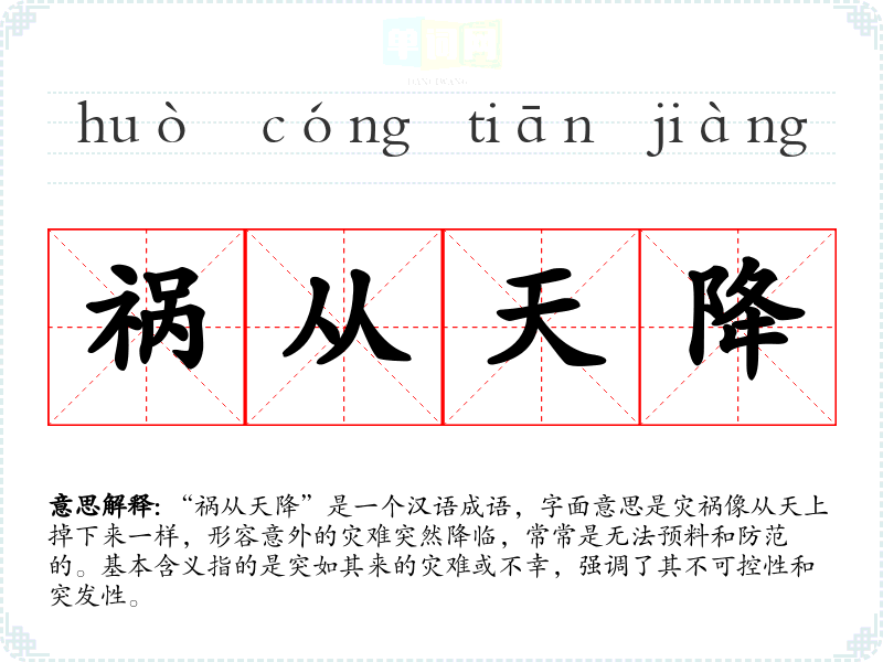 “祸从天降”是一个汉语成语,字面意思是灾祸像从天上掉下来一样,形容意外的灾难突然降临,常常是无法预料和防范的。基本含义指的是突如其来的灾难或不幸,强调了其不可控性和突发性。