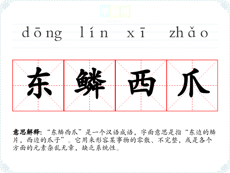 “东鳞西爪”是一个汉语成语,字面意思是指“东边的鳞片,西边的爪子”。它用来形容某事物的零散、不完整,或是各个方面的元素杂乱无章,缺乏系统性。