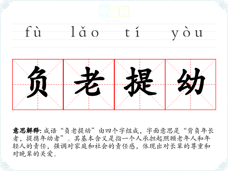 成语“负老提幼”由四个字组成,字面意思是“背负年**,提携年幼者”。其基本含义是指一个人承担起照顾老年人和年轻人的责任,强调对家庭和社会的责任感,体现出对长辈的尊重和对晚辈的关爱。
