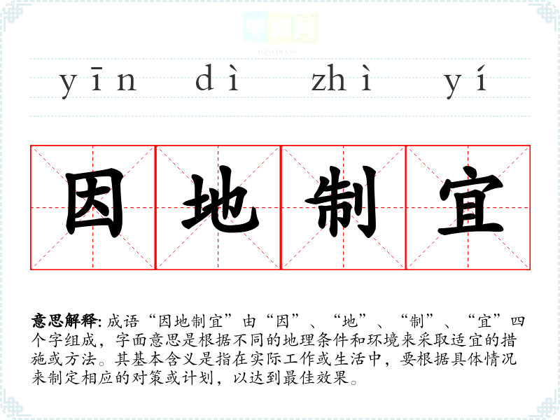 成语“因地制宜”由“因”、“地”、“制”、“宜”四个字组成,字面意思是根据不同的地理条件和环境来采取适宜的措施或方法。其基本含义是指在实际工作或生活中,要根据具体情况来制定相应的对策或计划,以达到最佳效果。