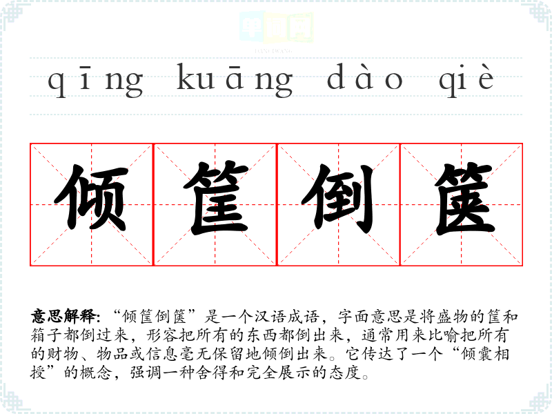 “倾筐倒箧”是一个汉语成语,字面意思是将盛物的筐和箱子都倒过来,形容把所有的东西都倒出来,通常用来比喻把所有的财物、物品或信息毫无保留地倾倒出来。它传达了一个“倾囊相授”的概念,强调一种舍得和完全展示的态度。