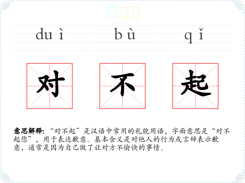 “对不起”是汉语中常用的礼貌用语,字面意思是“对不起您”,用于表达歉意。基本含义是对他人的行为或言辞表示歉意,通常是因为自己做了让对方不愉快的事情。