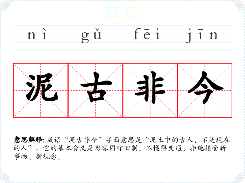 成语“泥古非今”字面意思是“泥土中的古人,不是现在的人”。它的基本含义是形容固守旧制,不懂得变通,拒绝接受新事物、新观念。